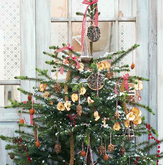 Z arašídového másla a krmných směsí pro ptáky smíchejte hmotu. Tou naplňte formičky na cukroví nebo pomažte rýžové raciolky a ty pak ještě obalte v zrní. Zavěste na strom a přidejte borové šišky, svázané klasy obilí, sušená jablíčka, vlašské ořechy. (viz úvodní foto)
