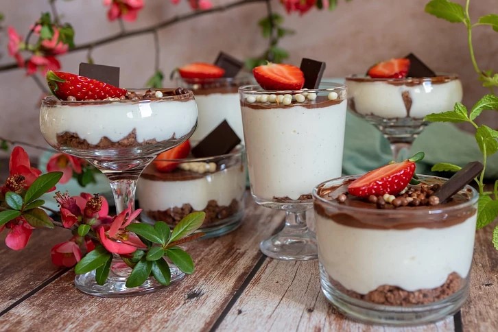 Kakaové sušenky rozdrtíme najemno. Máslo necháme rozpustit a zamícháme se sušenkami. Do skleniček připravíme sušenkový základ. Tvaroh dáme do mísy, přidáme cukr, vanilkovou pastu a trochu mléka – mícháme a podle potřeby přidáme mléko, aby vznikla požadovaná konzistence. Na sušenkový základ dáme tvaroh (alternativně část tvarohu, poté vrstvu rozvařeného ovoce a nakonec opět tvaroh). Čokoládu nalámeme a zalijeme vařící smetanou, metličkou rozmícháme do polevy. Čokoládovou polevou zalijeme skleničky, ozdobíme strouhanou čokoládou a čerstvým ovocem.