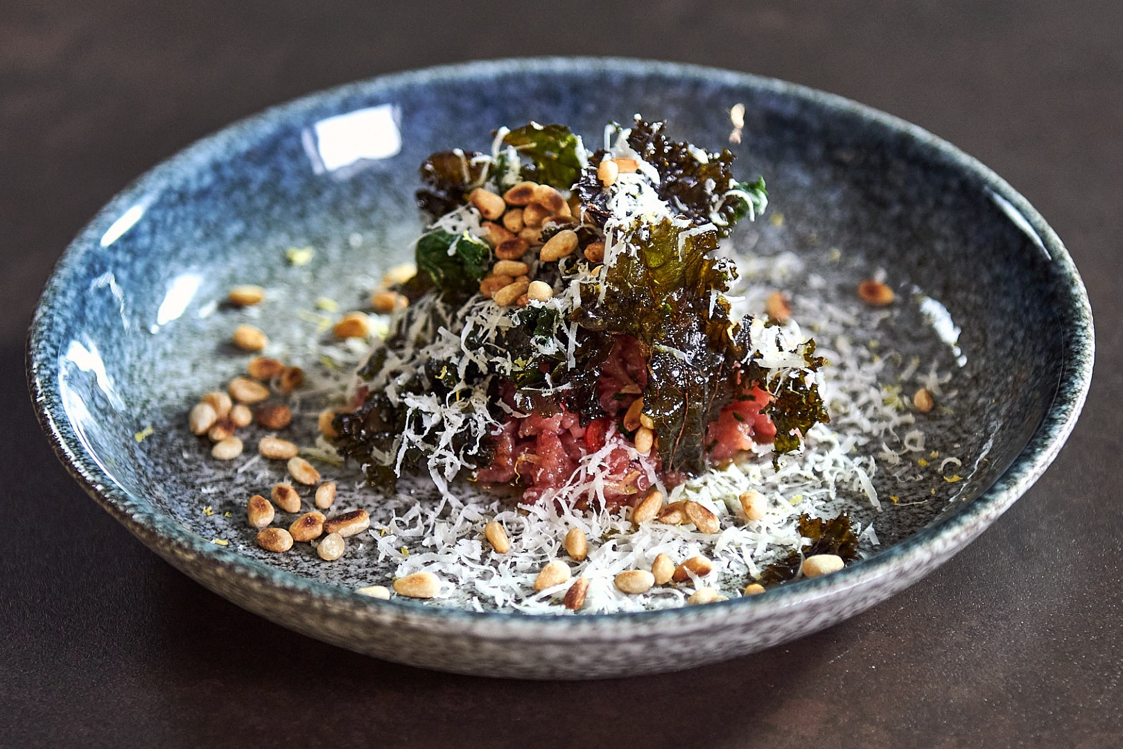 Hovězí maso odblaníme, očistíme a nakrájíme na jemné kostičky. Necháme při pokojové teplotě v míse odpočinout. Vychlazený hovězí lůj nakrájíme na drobné kostičky. Na plotně rozpálíme hrnec a do něj vložíme nakrájené kostičky loje. Necháme škvařit dokřupava. Dochutíme tatarský biftek. Přidáme sůl, pepř a kapku olivového oleje - ten zabrání tomu, aby se maso začalo marinovat a aby zbělalo. Promícháme, přidáme nastrouhanou citronovou kůru, kapku citronové šťávy a kvalitní sójovou omáčku. Podle libosti pak do tataráku přidáme drobně nakrájenou chilli papričku. Omytou pažitku nakrájíme nadrobno a vmícháme do masa. Připravíme kadeřávek. Listy kadeřávku natrháme na větší kusy (stonek nepoužíváme) a v hrnci rozehřejeme olej na smažení (ideálně na teplotu cca 160 °C). Kadeřávek vhodíme do rozpáleného oleje, hrnec rychle zakryjeme poklicí a velmi krátce osmažíme. Jakmile přestane obsah hrnec prskat a bubat, tak už je kadeřávek takřka osmažený. Z oleje vyjmeme kadeřávek na papírové utěrky, které odsají přebytečný tuk a ihned lístky osolíme. Čistou pánev rozpálíme na plotně a vysypeme na ni piniové oříšky. Necháme je rozvonět a opražíme. Jejich chuť tak bude mnohem výraznější. Můžeme servírovat. Maso smícháme s lojovými škvarky, můžeme přidat i trochu loje z hrnce. Ochutnáme a dochutíme podle potřeby solí a pepřem. Vsypeme opražená piniová semínka. Maso dáme doprostřed talíře, načechráme na hromádku, doplníme smaženým kadeřávkem. Zastrouháme citronovou kůrou, parmezánem a zasypeme zbylými opraženými piniovými semínky.