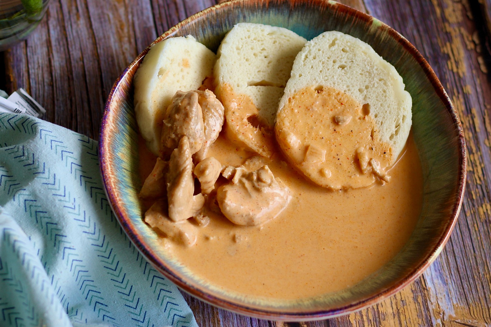 Cibuli oloupeme a nakrájíme najemno. Maso nakrájíme na větší kousky, dáme do misky, osolíme, opepříme a promneme, aby se koření dostalo všude. V hrnci rozehřejeme olej, zpěníme na něm nakrájenou cibuli a přidáme nakrájené maso. Krátce zarestujeme, aby se maso zatáhlo, poté zaprášíme sladkou paprikou, promícháme a ihned podlijeme kuřecím vývarem (jinak by se paprika mohla připálit a zhořkla by). Do hrnce přidáme bobkový list a vše dusíme pod pokličkou doměkka, až se maso pomalu začne rozpadat. Maso z omáčky vyjmeme, nalijeme do ní polovinu smetany a pokud je třeba, dolijeme ještě trochu vývaru. Vše přivedeme k varu. Ve zbytku smetany rozšleháme trochu hladké mouky a za stálého míchání vlijeme do vroucí omáčky. Metličkou rozšleháme, aby se netvořily hrudky, případně rozmixujeme ponorným mixérem dohladka (bobkový list před mixováním odstraníme). Dobře provaříme alespoň 15 minut, aby se ztratila chuť mouky, do omáčky vrátíme maso a vařič vypneme. Dosolíme a opepříme, případně můžeme zakápnout lžičkou octa. Jako příloha se hodí houskové knedlíky, ale také těstoviny i dušená rýže.