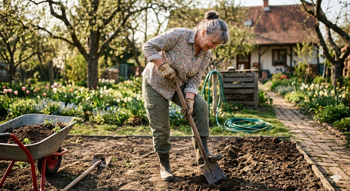 Máte vybrané místo? Důležité jsou také rozměry záhonu, zejména u toho zeleninového, který budete nejen plít a zalévat, ale také z něj budete sklízet úrodu. Nesmí být příliš široký, abyste pohodlně dosáhli doprostřed z obou stran a nemuseli na záhon šlapat. Ideální šířka je 100-120 cm. Záhon jste si změřili a teď můžete přistoupit k jeho vykolíkování. Do budoucích rohů umístěte kolíky a mezi ně natáhněte provázek, ať vidíte, kde pracovat. Pokud chcete postupovat klasickým způsobem, rýčem odřízněte horní vrstvu trávy (drny můžete zkompostovat kořeny vzhůru). Půdu prokypřete (lze použít i rotavátor) a zapracujte do ní kompost (vrstvu zhruba 8-10 cm), aby byla úrodnější. Myslete na to, že zejména zelenina potřebuje velmi výživnou půdu, aby vám později bohatě plodila. Na jaře se však nepoužívá hnůj, protože k rozložení živin v něm obsažených, potřebují půdní mikroorganismy víc času. Nakonec vrchní vrstvu urovnejte hráběmi pěkně do roviny a odstraňte vše, co na záhon nepatří - kameny, větve.