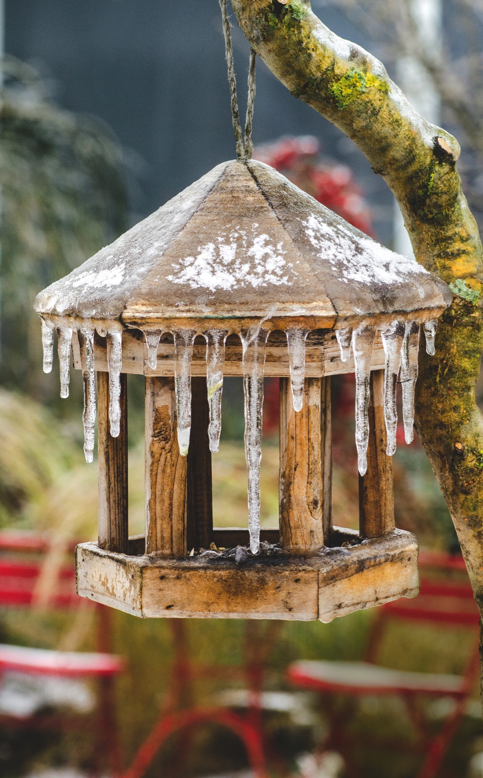 Dokonalým objektem pro ledové objetí jsou stébla trav. Jak tak stojí nehybně, zatěžkané ledovým kabátem, působí nesmírně klidným dojmem a zahradě propůjčují zvláštní magickou atmosféru. Jestliže ale mrznoucí déšť neustane včas, zbortí se pod tíhou ledové nálože k zemi. Myslete na to a před zimou svažte trsy do snopů. S jejich zpětným řezem pak počkejte až do jara. Uschlá hmota chrání kořeny před nepřízní počasí a poskytuje útočiště přezimujícímu hmyzu. Zatmco ježci, brouci nebo žáby nehostinné období prospí, ptáci, kteří neodletěli na jih, navštěvují zahradu nízkým teplotám navzdory. Sýkory, vrabci, pěnkavy, zvonci a pestře zbarvení stehlíci právě teď spoléhají na naši pomoc. Když se přes ledový příkrov nedostanou k semenům rostlin ze záhonů, nasypte jim do krmítka zrní a slunečnici. Nejen hodující opeřenci, ale také nejrůznější zahradní dekorace, nádoby, nábytek z odolného materiálu zaručí, že si výhled na ledové zimní království pořádně užijete.