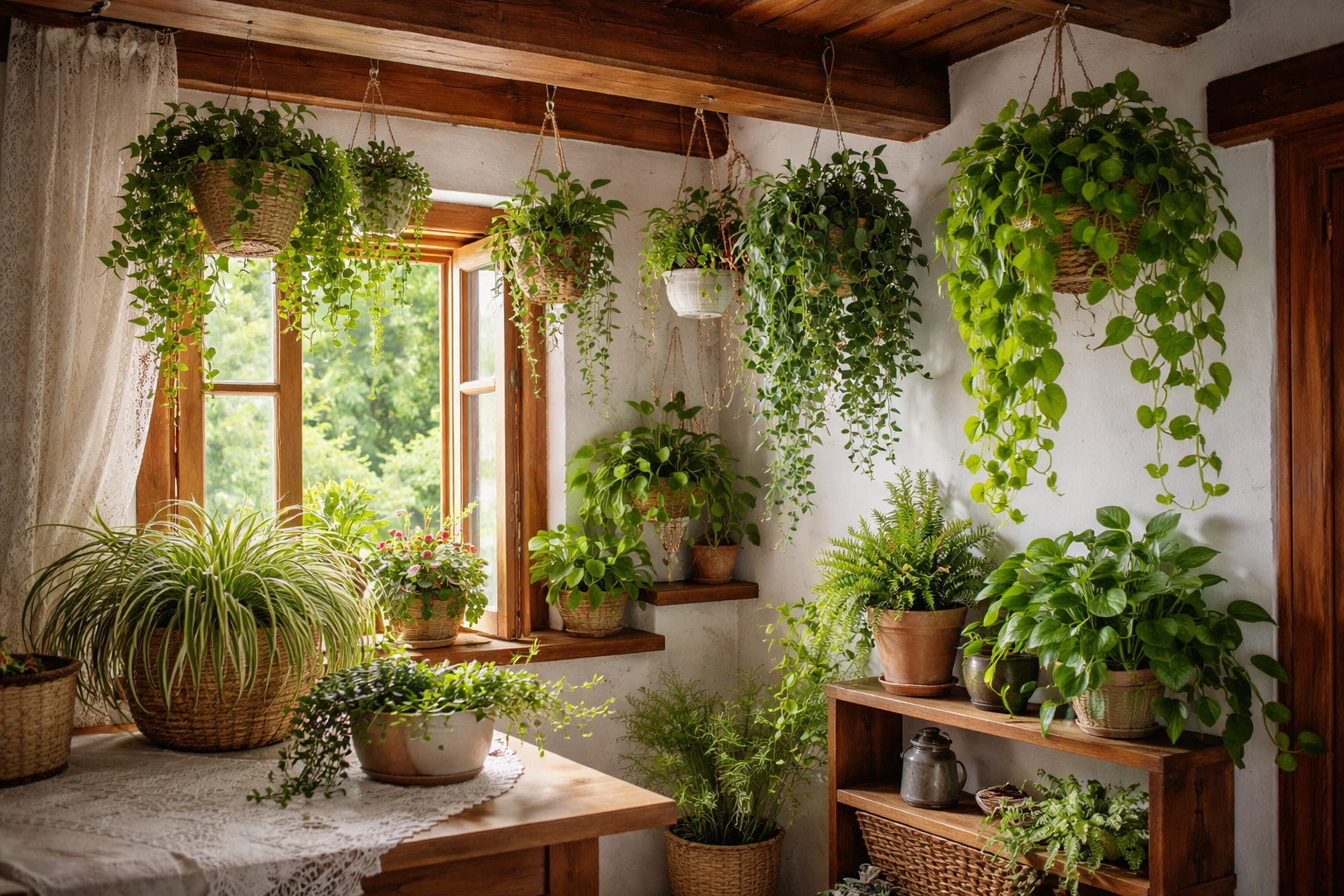 Chalupářský interiér je specifický. Dřevo, kámen, někdy chladnější kouty, jindy ostré letní světlo. Ne každá pokojová rostlina se tu cítí dobře. Převislé pokojovky jsou ale sázka na jistotu. Nezaberou místo na podlaze, dají se snadno přesouvat a dokážou i obyčejnou polici proměnit v živý prvek. Na chalupě často bojujeme s místem. Malé místnosti, nízké stropy, kombinace starého nábytku a novějších prvků. Převislé rostliny pracují s výškou. Když je umístíte na horní polici nebo do závěsného květináče, opticky natáhnou prostor a odlehčí ho. Další výhoda je praktičnost. Chalupa není vždy vytápěná stejně jako městský byt. Některé dny jste pryč, zálivka není pravidelná. Řada převislých druhů snese občasné sucho lépe než náročné tropické solitéry. A pak je tu atmosféra. Splývající šlahouny změkčí trámy, skryjí kabely, zjemní rohy skříní. Interiér přestane působit tvrdě a získá přirozený rytmus.