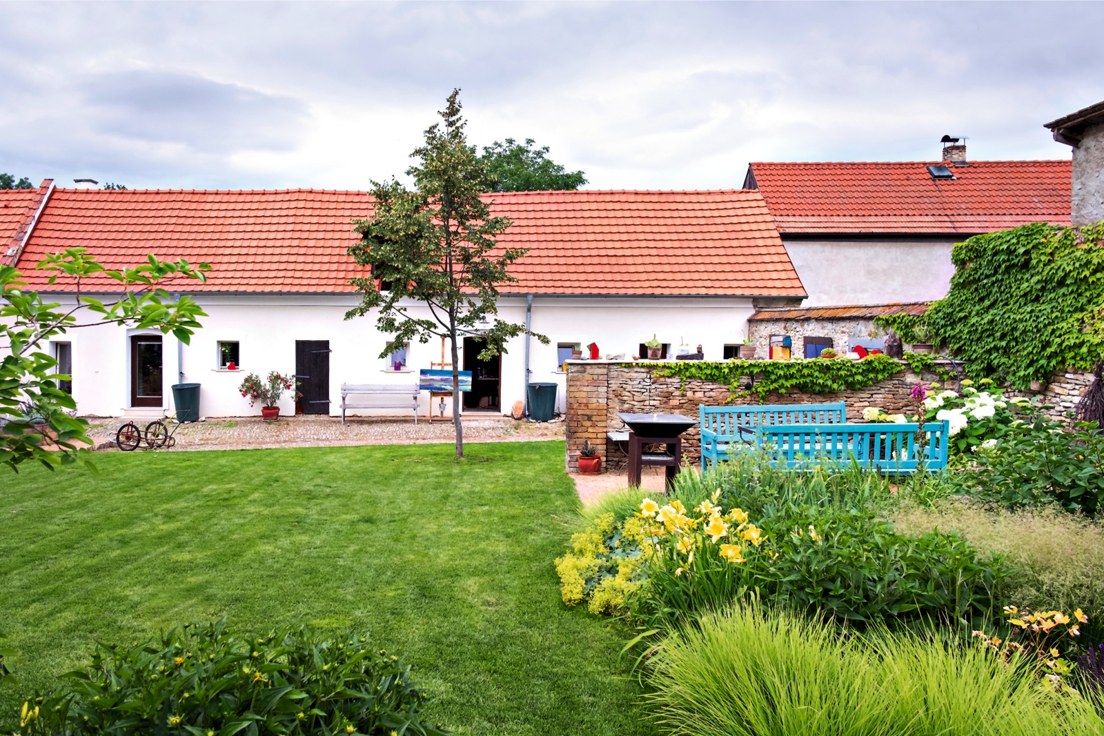 V bývalém chlévě vznikl dokonce malířský ateliér pána domu. Co ale stále zůstávalo nedořešené, byla zahrada, ve kterou se měl proměnit dvůr. „Chtěli jsme prostor, na němž bychom mohli trávit co nejvíc času, jehož údržba by neznamenala jen pot, krev a slzy, a přitom vypadal hezky. Venkovsky, tradičně, tak, aby pěkně ladil s domem,“ shodují se manželé. Pak náhodou viděli v televizi rozhovor se zahradním architektem Lefflerem a rozhodli se jej oslovit.