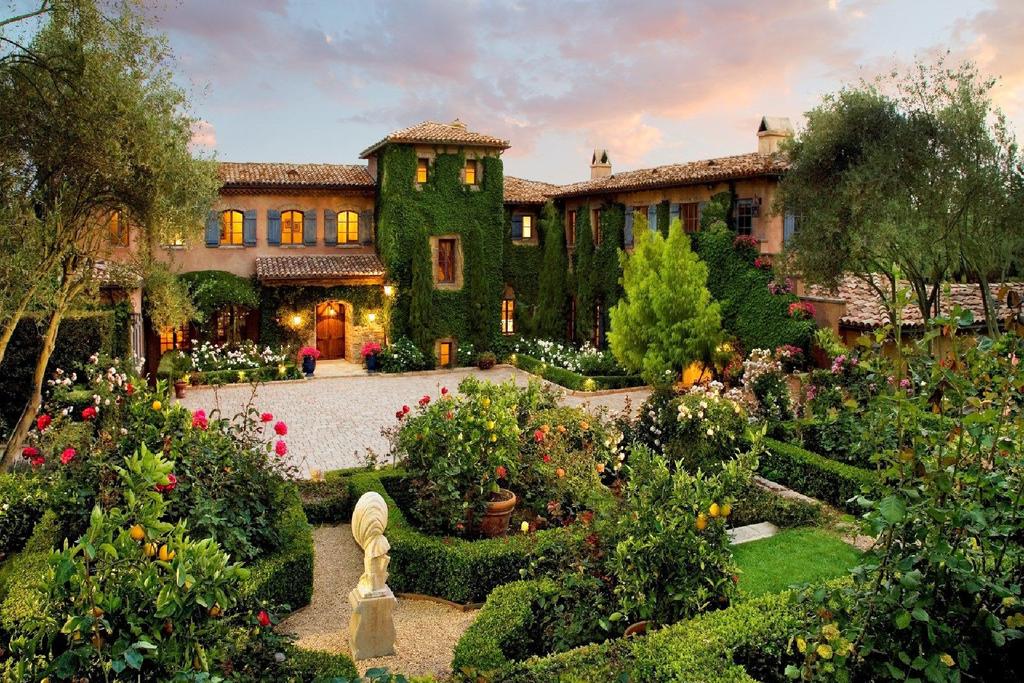 Spíš než o domě, musíme mluvit o zámku. Toto sídlo má totiž devět ložnic a 16 koupelen a je víc než honosné. Veliké zahrady, které hlavní budovu obklopují, jsou obrovské a mají středomořskou atmosféru. Nechybí růžový sad, italské cypřiše, lány levandule, ale také staleté olivovníky. Samotný dům je postavený z místního kamene a z části je pokrytý popínavým břečťanem. Hlavní rezidenci dominují dřevěné prvky a zemité tóny. Obývacímu pokoji kraluje kamenný krb a knihovny, jídelna pojme spoustu hostů, je zde také rodinné kino, nebo soukromá vinotéka. Exteriér je přizpůsobený k pobytu venku. Je tu proto venkovní kuchyně, různá posezení, chatky, čajovna, tenisový kurt a samozřejmě bazén. Veškeré fotografie interiéru byly pořízeny před nastěhováním rodiny realitním domem Zillow, a tak je pravděpodobné, že došlo ještě na nějaké změny v zařízení jednotlivých místností.