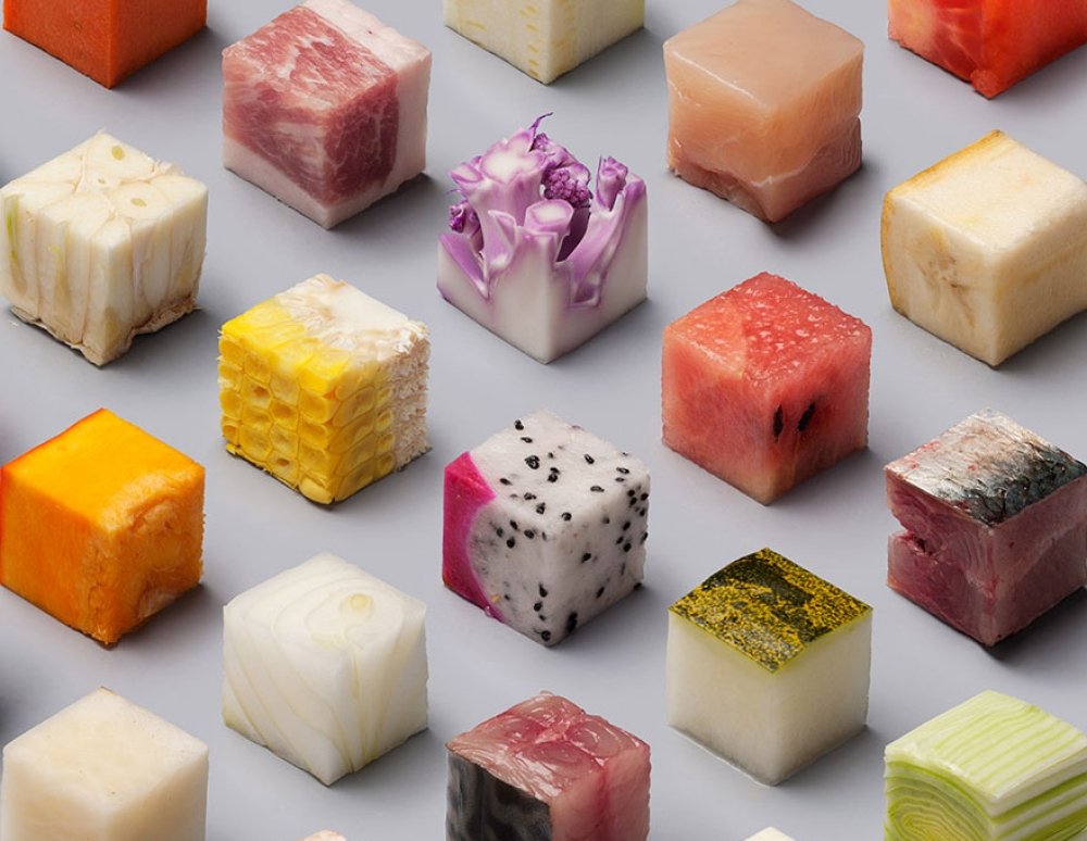 Nizozemští umělci Lernert & Sander si vzali různé tepelně nezpracované potraviny a z nich vytvořili dokonalého umělecké dílo. Přetranformovali je do kostek s přesnými rozměry 2,5 x 2,5 x 2,5 cm. Můžeme na nich nechat zrak a slibujeme si, že se taky naučíme krájet!