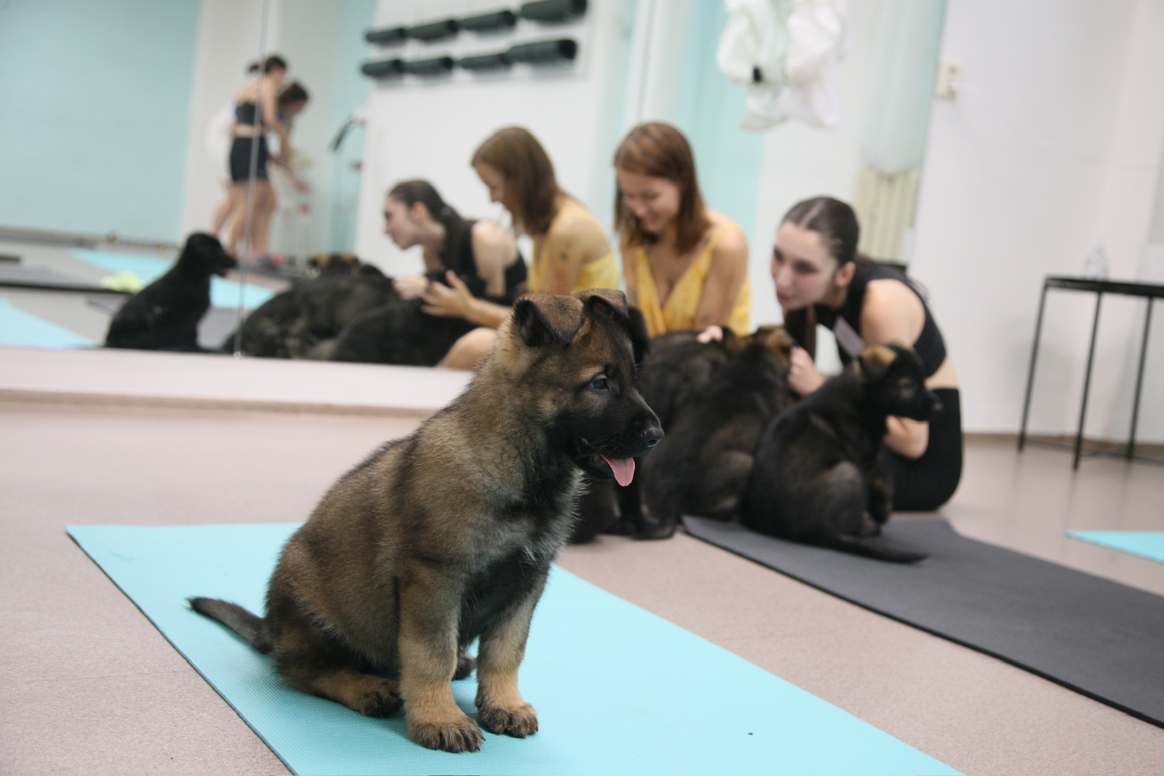Když vejdete do místnosti, v níž se cvičí, jsou tam již připravené podložky do půlkruhu, uprostřed má jógamatku lektorka, a v prostorách pobíhají rozkošná štěňátka. Ta jsou stará obvykle 7-13 týdnů a vždy se jedná o jedno plemeno – o takové, jehož lekci si vyberete. Já zvolila tu s německými ovčáky, takže na místě bylo zhruba deset chundelatých Rexů. Po příchodu máte několik minut, kdy se s pejsky můžete mazlit a celkově tak trochu seznámit. Pak jde každý na svou jógamatku a začíná lekce.