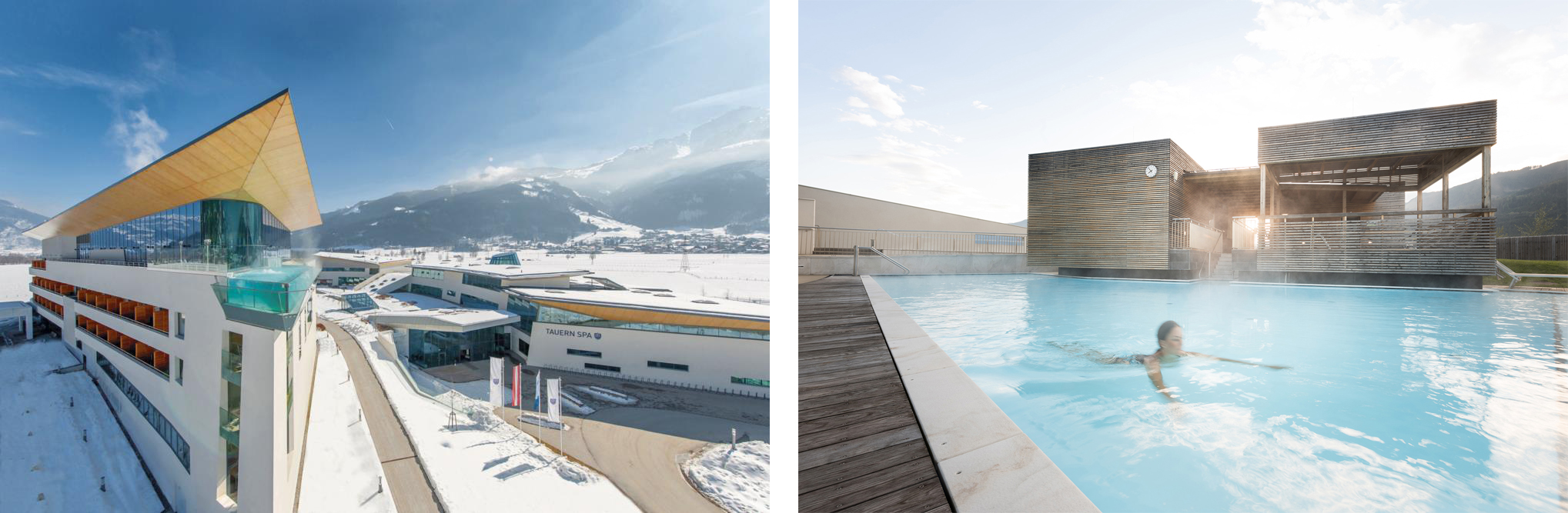 Po lyžích potřebujete velký relax a věřte, že nikde jinde než v hotelovém komplexu Tauern Spa v Kaprunu si ho nevychutnáte lépe. Venkovní bazény se slanou i sladkou vodou nabízejí panoramatický výhled na horské pásmo Národního parku Vysoké Taury, vodopády, vodní masáže a všelijaké světelné a hudební efekty.