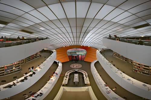 Trošku z jiného soudku je univerzitní knihovna v Berlíně. Návštěvníci se domnívají, že nejatraktivnější je v noci, kdy vnitřní osvětlení svítí přes průhledné přepážky, a díky tomu tvoří šachovnicový efekt. Ve vzdušném a skvěle řešeném prostoru musí být radost se učit. :-)