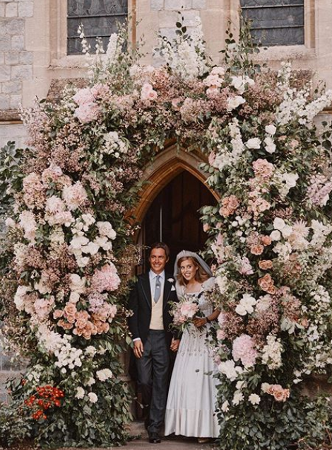 Buckinghamský palác hned v pondělí ráno zveřejnil oficiální svatební fotografie. Pár byl zachycen před Královskou kaplí Všech svatých na hradě Windsor v doprovodu královny Alžběty II. a prince Filipa. Právě královna Alžběta II. sehrála v předsvatebních přípravách důležitou roli, neboť princezně Beatrice zapůjčila své šaty od Normana Hartnella, které si v roce 1962 oblékla na premiéru filmu Lawrence z Arábie. Šaty samozřejmě musely projít drobnými úpravami, na kterých se podílela stylistka Angela Kelly. Celý svatební look doplnila princezna Beatrice diamantovou tiárou královny Marie, který na sobě měla i královna Alžběta II. při sňatku s Filipem v roce 1947.