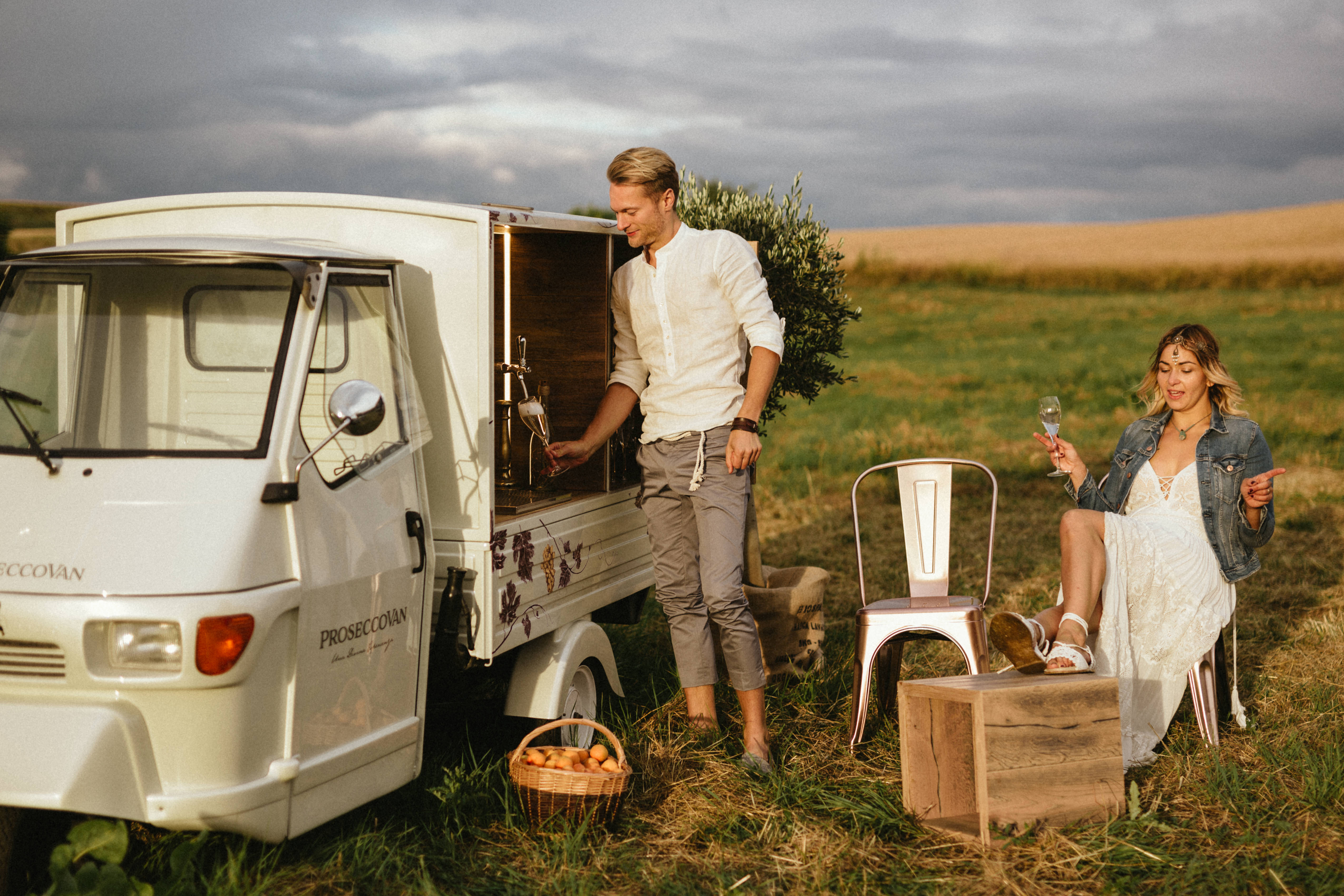 Na zámku Bon Repos byl krásný letní den a my byli ve víru příprav Svatby Marianne. V dálce nás upoutalo malé vozítko, které se k nám pomalu, ale jistě přibližovalo. Okouzleni roztomilostí retrotříkolky Piaggo jsme se vydali na průzkum. Že by nějaký svatební dar nebo s ní novomanželé pojedou na svatební cestu? Důvod její přítomnosti byl mnohem lepší. Byla totiž plná prosecca!