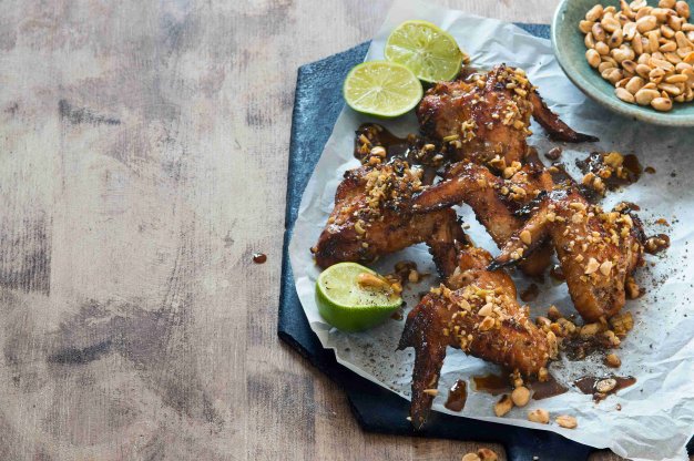 2 Troubu vyhřejte na 200/180°C. Křidýlka vyjměte z marinády, vložte do pekáčku a pečte 25–30 minut dozlatova. Každých 5 minut otočte. Nakonec přelijte zbylou marinádou, posypte drcenými arašídy, zvyšte teplotu v troubě na 220/200°C a dopečte ještě asi 5 minut.