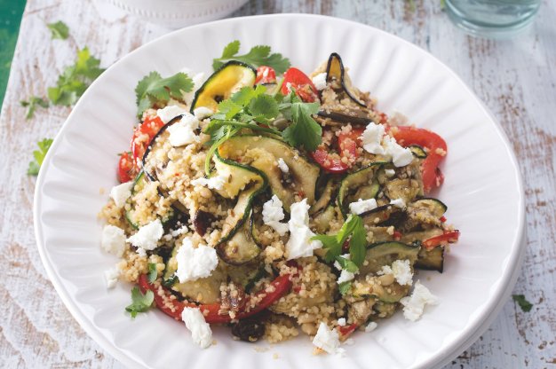 3 Kuskus promíchejte s citronovou šťávou, chilli, piniovými oříšky, rozinkami a 2 lžícemi oleje. Osolte a vmíchejte grilovanou zeleninu, fetu a koriandr. Podávejte s hummusem.