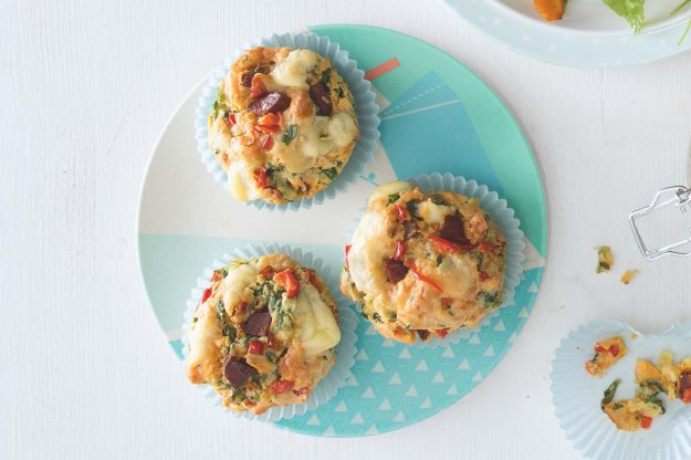 3 V míse promíchejte mouku a kypřicí prášek. Přidejte sýr, chorizo s paprikou a špenát, promíchejte a uprostřed udělejte důlek. Vejce prošlehejte s mlékem a máslem a vlijte do důlku. Vše krátce promíchejte. Těsto rozdělte do formiček a pečte 20–25 minut.