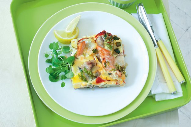 1 Troubu předehřejte na 170 °C. Na rozehřátém oleji orestujte cibulku, přisypte papriku a celer a poduste doměkka. Přidejte kousky ryb a restujte 3 minuty, pak přisypte kostičky cukety a směs ještě 5 minut restujte. Míchejte opatrně, aby se ryby nerozpadly. Směs osolte a promíchejte ji zlehka s plátky brambor a nasekanými bylinkami.