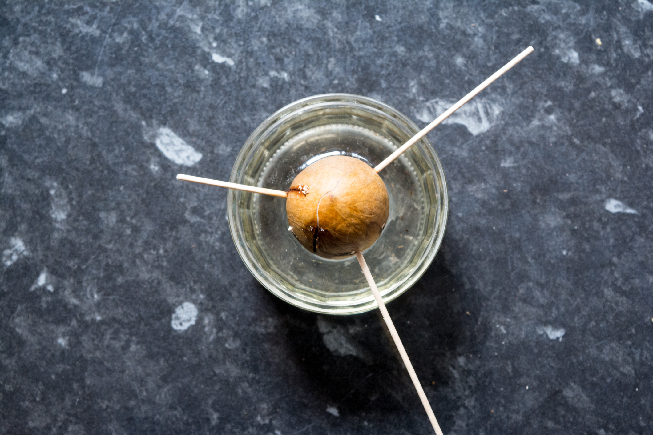 - Následně si připravte sklenici s vodou, do které pomocí třech párátek upevníte pecku. Myslete na to, že z ploché strany budou růst kořínky, a tak právě tuto stranu ponořte do vody. Zašpičatělá část pecky naopak nesmí být ponořená ve vodě.