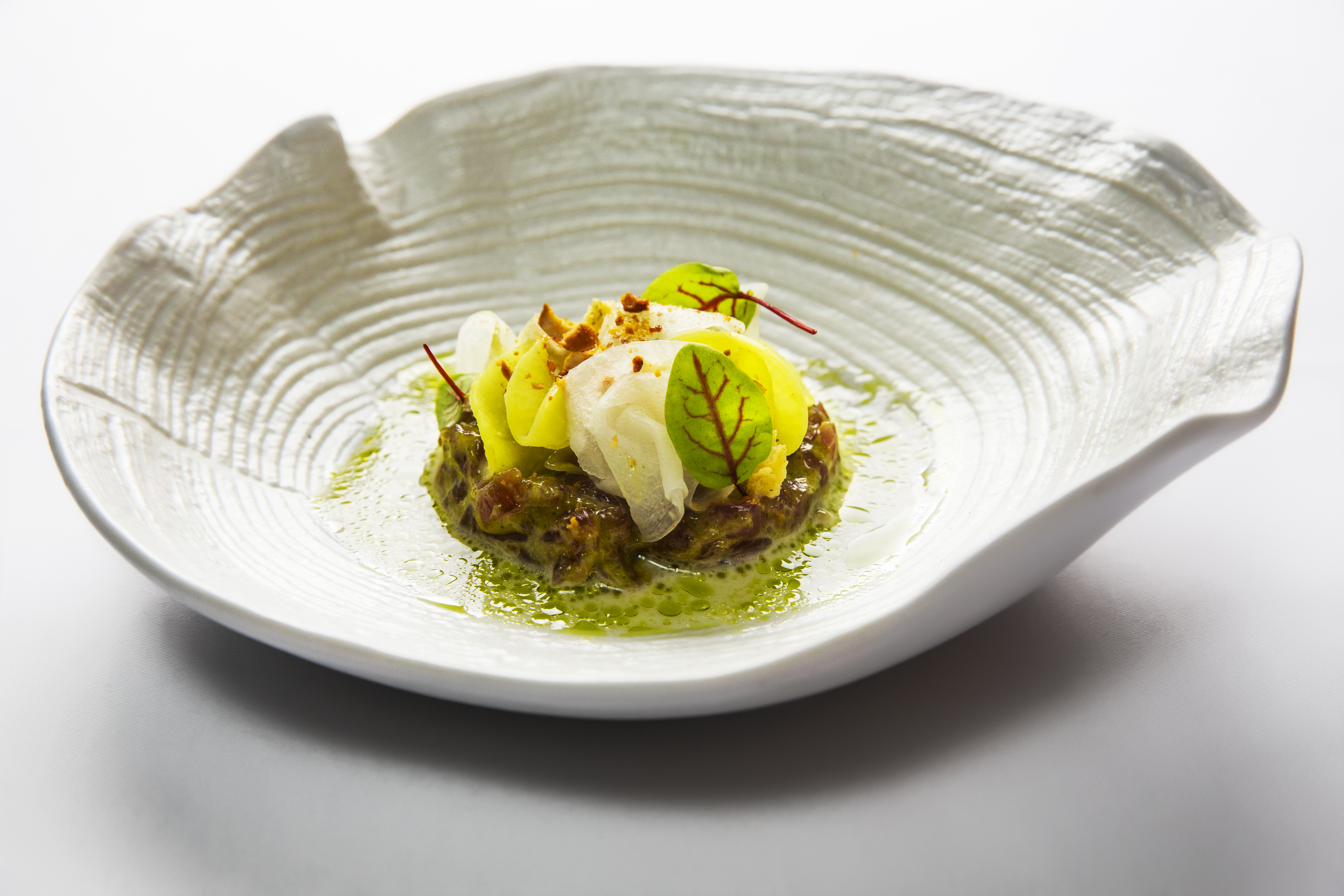 Při servírovaní do kulatého tvořítka vložíme 10 minut marinovaného tuňáka. Na tuňáka naskládáme čtyři tenké plátky bílé ředkve a čtyři plátky japonské žluté ředkve. Obě ředkve se můžou namarinovat ve wasabi omáčce. Můžeme je posypat opraženými kešu oříšky a zalijeme wasabi omáčkou s koriandrovým olejem.
